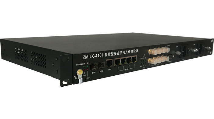ZMUX-4101設備由機箱、系統母板、主控板、1~2塊電源板和1~4塊I/O接口板組合而成,可選配1~2路光纖鏈路接口、1~4路物理隔離100M以太網接口、1~4路E1接口、1~32路通用接口、雙路電源1+1保護,支持集中網管監控功能,帶內網管傳輸。
