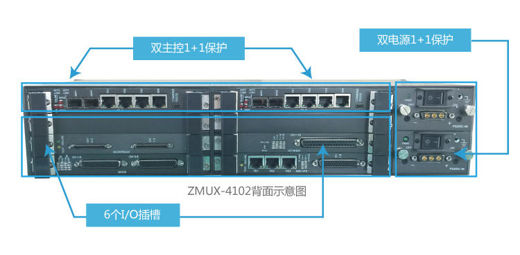 2)全系統(tǒng)冗余:除雙IP鏈路保護,ZMUX-4102還能提供雙主控板1+1保護、雙電源1+1保護等冗余機制。